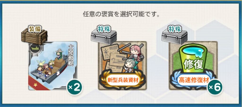 選択報酬で、大発動艇×2or新型兵装資材or高速修復材×6